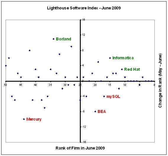 The biggest drop this month is in the ranking of Mercury which is down 10 ranks. It continues to lose ground after its acquisition by HP as analysts make fewer mention of its brand name. BEA is another firm which is losing its ranking after its acquisition and has gone down 8 positions this month. mySQL, which was up last month due to news of Sun’s acquisition by Oracle, has also dropped down and is ranked 17th this month.